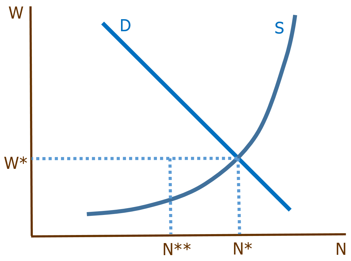 Doch es kommt noch schlimmer. Dieses Diagramm zeigt an, dass N*-N** auf beiden Seiten des Marktes gleich ist: Die Zahl der Arbeitnehmer, die nach Arbeit Ausschau halten, entspricht genau der Anzahl der Jobs, die Arbeitswillige suchen.
